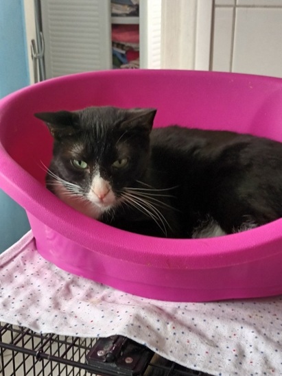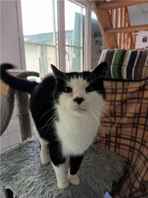 Barakouda, mâle noir et blanc. Né le 01/02/2019. Une voiture lui a fracturé le bassin et les pattes arrière mais il a retrouvé sa mobilité. Sans être sociable, il est gentil et peut se laisser caresser.