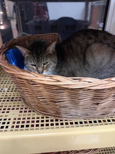 Frou Frou, femelle tigrée claire née le 10/07/2010. Âgée, elle se laisse caresser.
